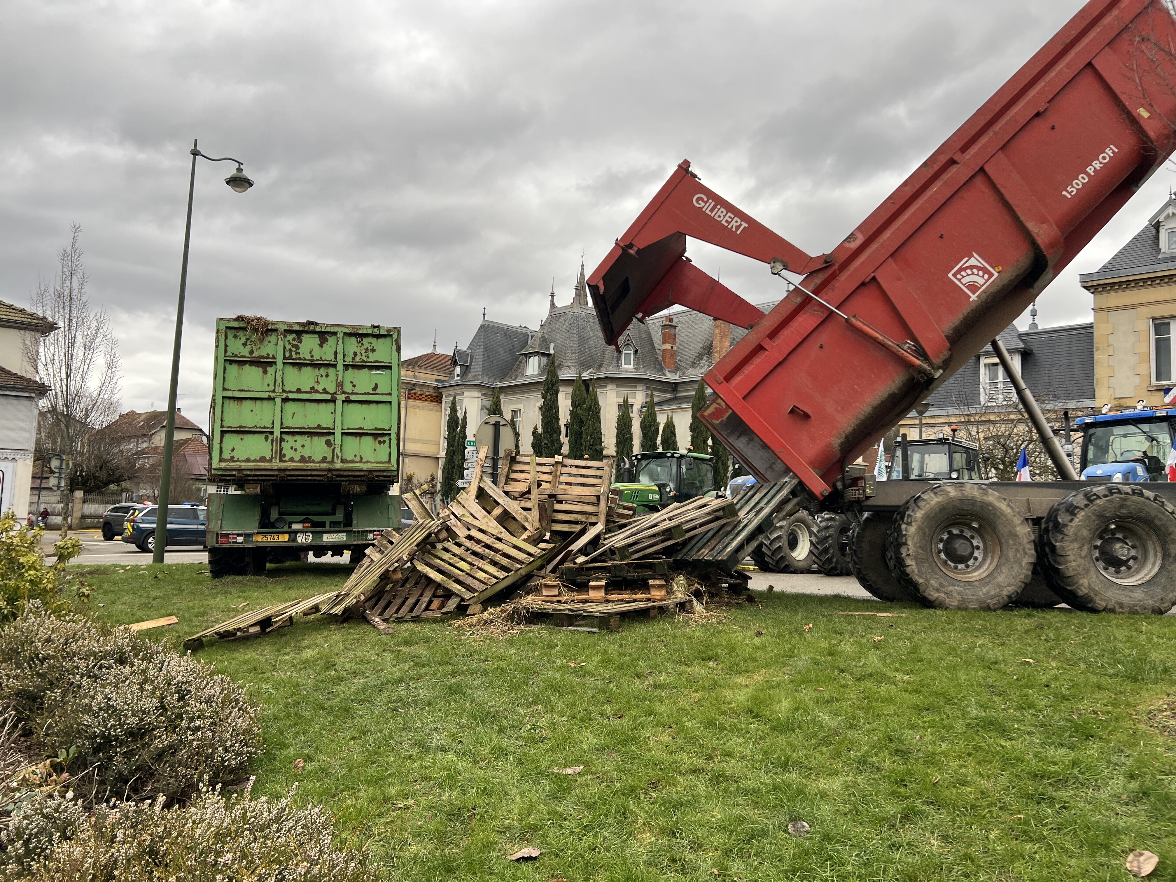 Après avoir fait un grand feu devant la sous-préfecture, les agriculteurs sont repartis en direction de l'échangeur de l'autoroute où ils ont déposé deux bennes de pailles et déchets végétaux en signe de protestation.
